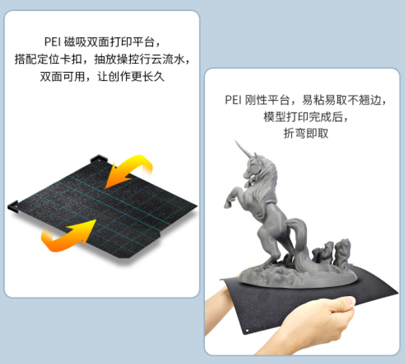 PEI磁吸雙面打印平臺,不僅雙面可用,在打印過程中更是易粘易取不翹邊,內置的收納盒設計,不丟失每一個小細節(jié)。