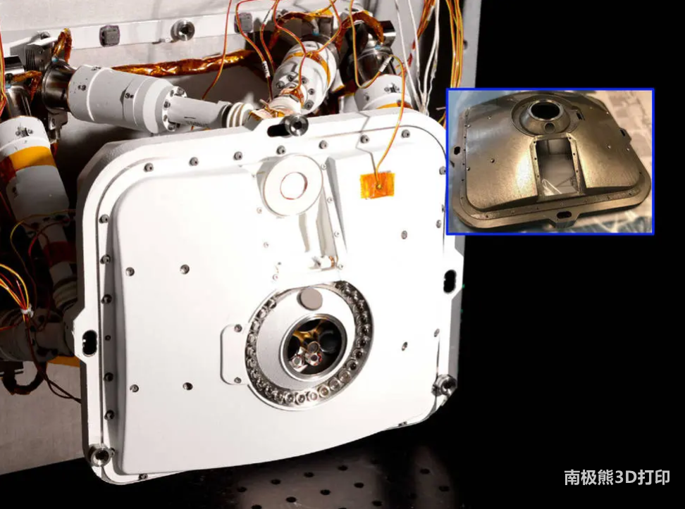 △美國(guó)宇航局的 "毅力號(hào) "火星車上的儀器之一PIXL的外殼包括幾個(gè)由3D打印鈦制成的部件,插圖顯示了它兩片式外殼部分的前半部分