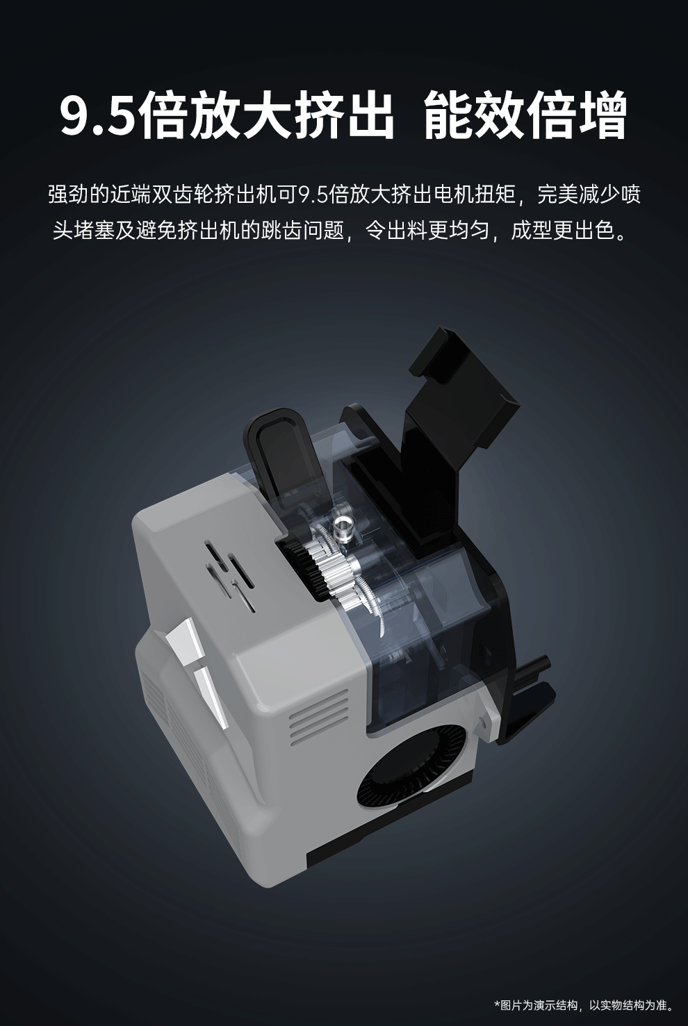 300*300*350mm最大成型空間·9.5倍放大擠出,使出料更均勻,成型更出色,搭載智能風(fēng)扇控制系統(tǒng),讓高達(dá)8500r/min的轉(zhuǎn)速降低噪音,還可以模型散熱更全面的同時(shí)高速打印