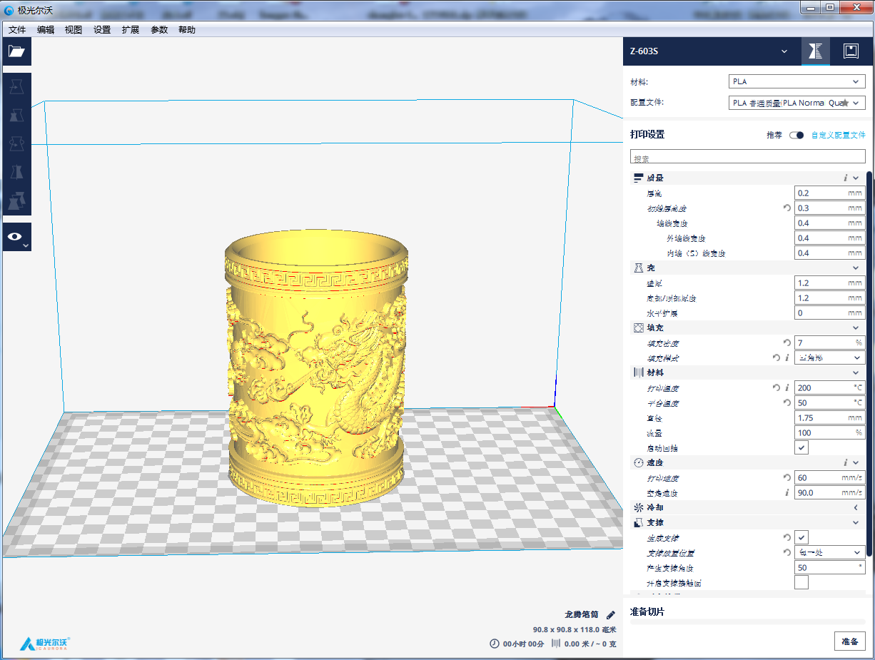 開始打印前,需要再次檢查一遍模型信息,保證模型的各項(xiàng)參數(shù)是正確的。點(diǎn)擊主菜單選擇模型信息即可。其次就是要保證,模型不逾越機(jī)型本身的打印范圍。比如機(jī)器的打印尺寸是280mm*180mm*180mm,那么我們要保證模型在這個(gè)尺寸范圍內(nèi)。(一般切片軟件里都設(shè)置好了,不搞錯(cuò)機(jī)型就好,超出了就是灰色,顯示的是無法切片或者提示文件過大無法切片)