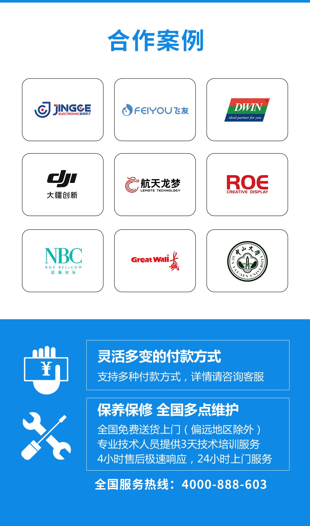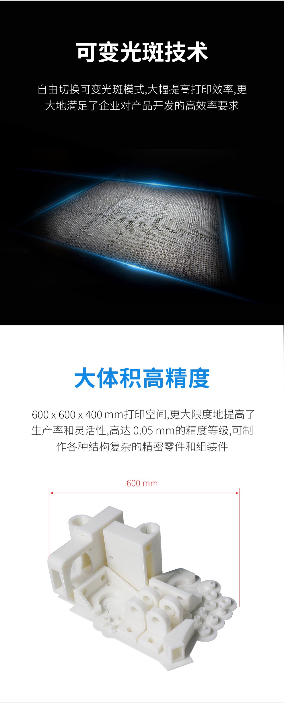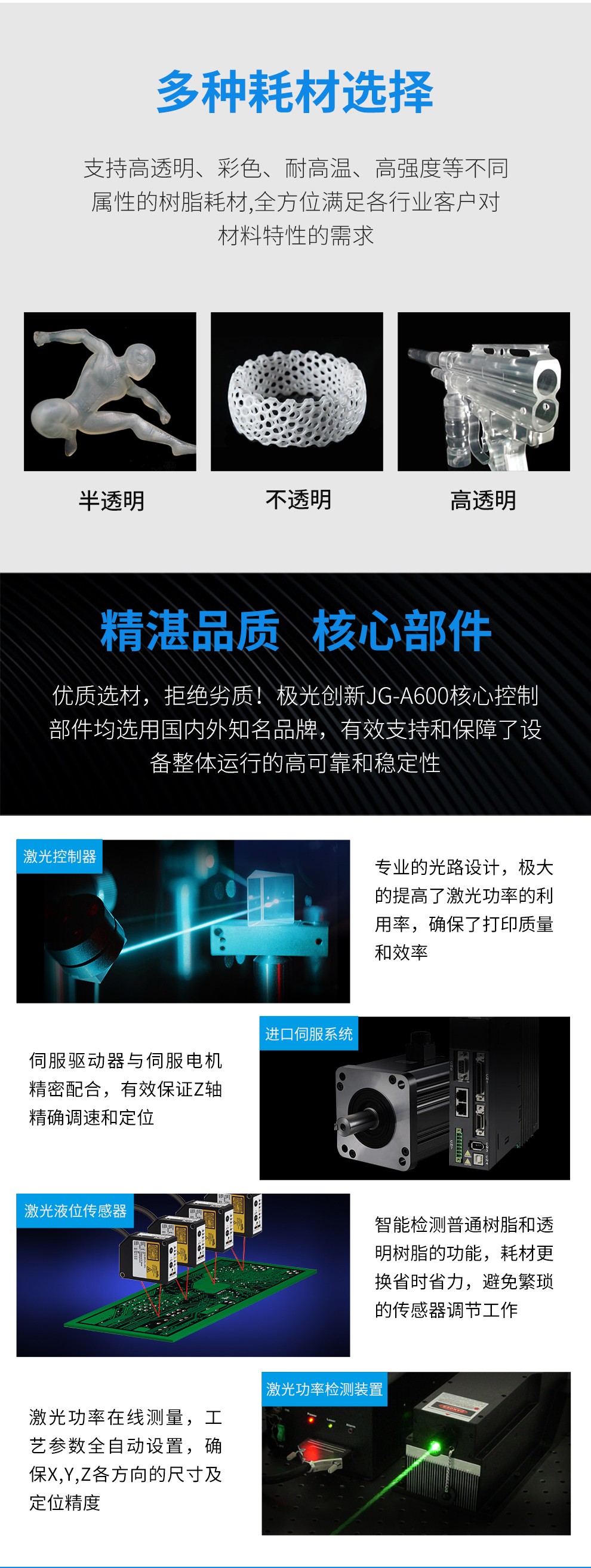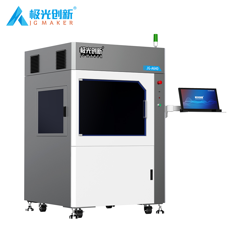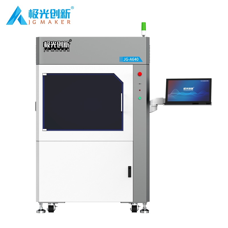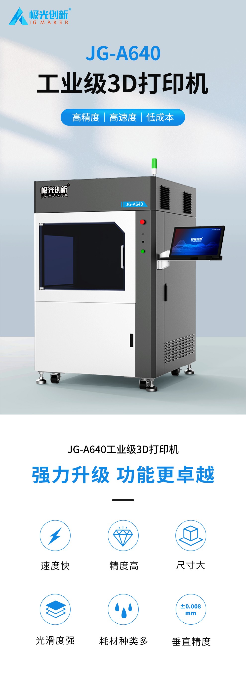 型號JG-A640,其最大成型尺寸可達600mm(X)*600mm(Y)*400mm(Z),精密制作層厚 0.1mm,極大程度的滿足了用戶對尺寸與精度需求,同時使用全固態(tài)激光器。