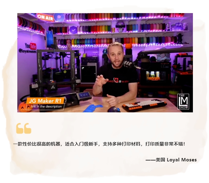 最近幾個月,極光創(chuàng)新R1憑借其極具人性化的簡單設(shè)計和高精度的打印質(zhì)量,被海外市場一致認為是最具性價比的入門級3D打印機,受到眾多消費者的喜愛,許多權(quán)威人士和社媒博主都對這款3D打印機給予了高度評價,認為它是入門級用戶的理想選擇。