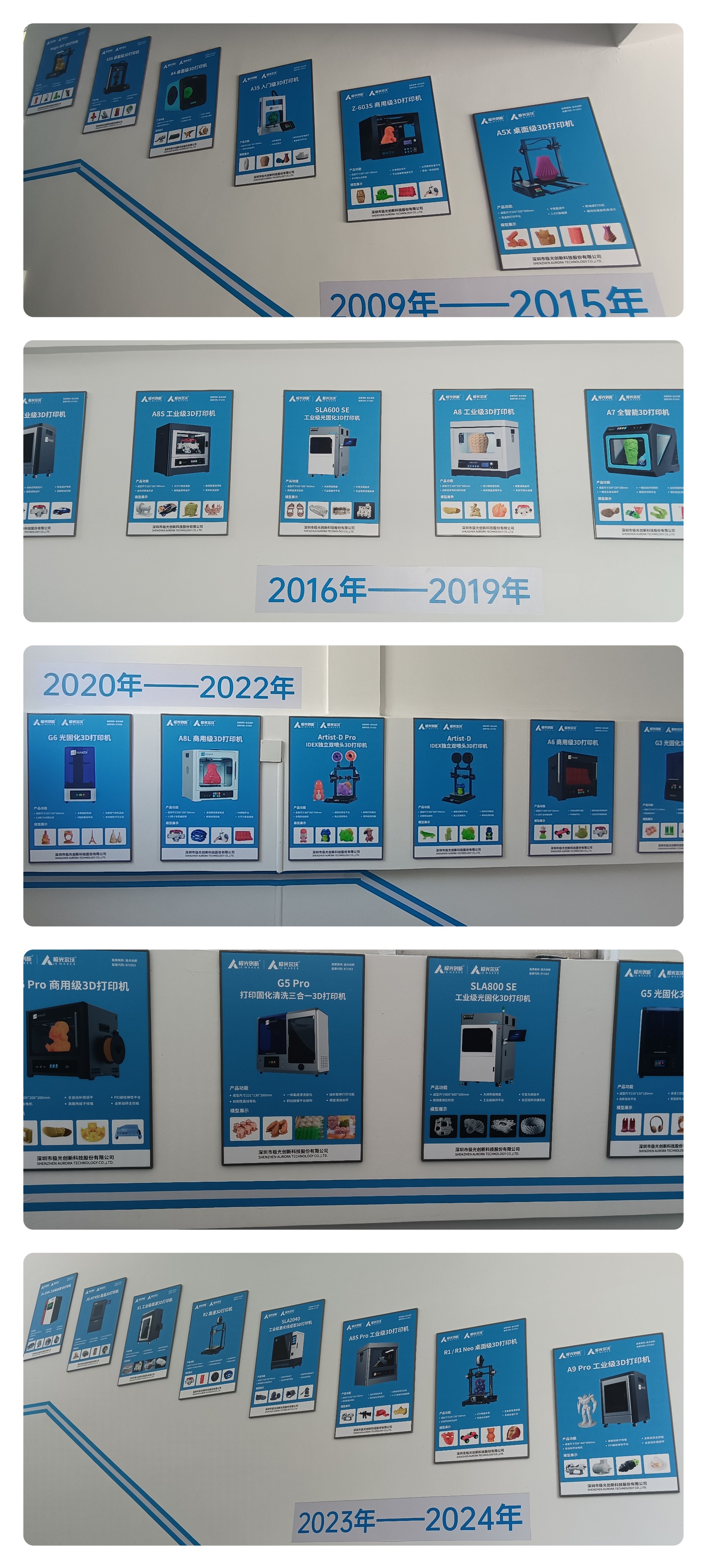 為了展現(xiàn)公司的發(fā)展歷程和輝煌成就,極光創(chuàng)新特意在入門(mén)處設(shè)置了產(chǎn)品展牌。從A5X到R2,從G3到G5 pro,從Z-603S到A8S,再到如今的工業(yè)級(jí)產(chǎn)品矩陣——SLA 2040、SLA 640、SLA 850、SLM 300等,每一款產(chǎn)品都是團(tuán)隊(duì)努力的智慧結(jié)晶。這些展牌如同一部時(shí)光機(jī),回顧著極光創(chuàng)新走過(guò)的每一步,帶領(lǐng)大家感受創(chuàng)新的力量。