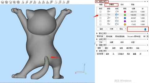 ②在左側(cè)視圖工具頁,選擇“多截面”,類型中即指不同方向軸的截面,當(dāng)然我們也可以點(diǎn)擊展開后自行選擇別的截面,如3點(diǎn)確定一個(gè)別的角度的截面。勾選激活某個(gè)截面后,拉動(dòng)下方的移動(dòng)軸即可控制模型上的截面的移動(dòng)。同時(shí)我們也可以在“剖視”欄選擇不同的視圖效果,把截面移動(dòng)至自己需要切割的位置。